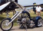 A friend of mine in the U.S.A. sent me this picture a couple of weeks ago, because he knew my love of alternative styles of locomotion, (Mad cars and bikes!) and knew I would love it! It is a custom motorcycle, but the engine is an aircraft engine, from a WWII Grumman Wildcat fighter! it must be making close to, if not more than, 1000 horsepower, compared to the average bike engine of maybe at most a 100 horsepower! My first thought was 'WHOA!' Awsome engineering! But just lately I spotted something else! Can you see it?